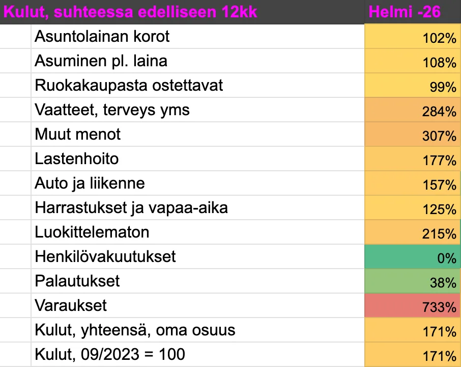 Alkuun vähän selvennystä siitä, mitä luvut pitävät sisällään. Laitamme vaimon kanssa palkat tasan keskenämme ja maksamme yhteistililtä kaikki menomme. Perheemme toinen lapsi syntyi vuoden 2024 alussa, ja tulotasomme on nyt normaalia matalampi, koska olen perhevapaalla. En huomioi sijoitusasuntomme rahavirtoja säästöasteen laskennassa.