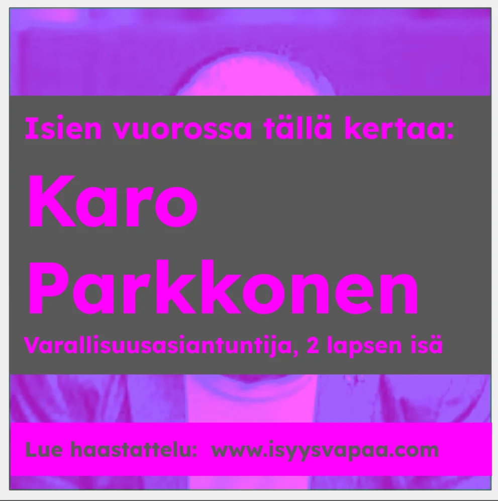 Kun mietin, kenet haluaisin mukaan Isien vuoro -haastattelusarjaan, Karo oli luonnollinen valinta. Hänen näkemyksensä yhdistävät taloudellisen osaamisen, vanhemmuuden arjen ja perheen erityispiirteet tavalla, joka inspiroi ja herättää ajatuksia. Tässä haastattelussa Karo jakaa ajatuksiaan isyydestä, perheen talouden hallinnasta ja siitä, miten hän onnistuu tasapainottamaan työn, perhe-elämän ja sijoittamisen.