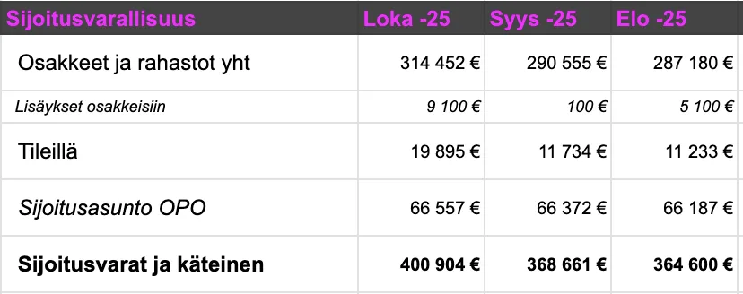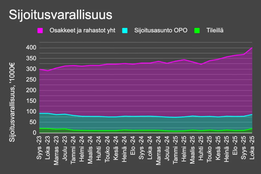 Lokakuun varallisuus kasvoi poikkeuksellisen paljon, sillä kuukauteen mahtui kertaluonteinen, palkkatulojen ulkopuolinen noin 16 000 € rahasumma, joka kasvatti varallisuuttani tavallista enemmän. En nyt poikkeuksellisesti avaa sen lähdettä tämän enempää, mutta sen voin kertoa, ettei kyse ollut mistään laittomasta!
