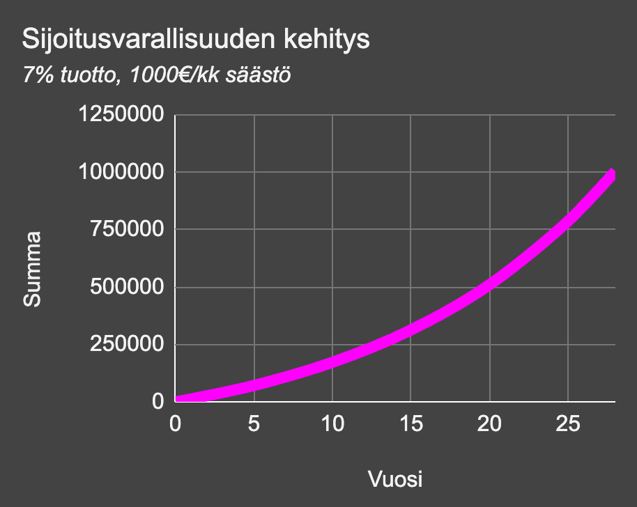 Otetaan esimerkiksi minun tilanteeni: noin miljoonan varallisuudella olisin taloudellisesti riippumaton palkkatyöstä, sillä neljän prosentin säännön mukaan se summa riittäisi kattamaan vuosittaiset kulumme. Säästän n. tonnin kuussa indeksiin, jolle voi olettaa vaikkapa 7%:n tuottoa. Kuukausisäästölaskurien mukaan miljoonan euron varallisuuden kartuttamiseen kuluisi tällä tahdilla 28 vuotta.