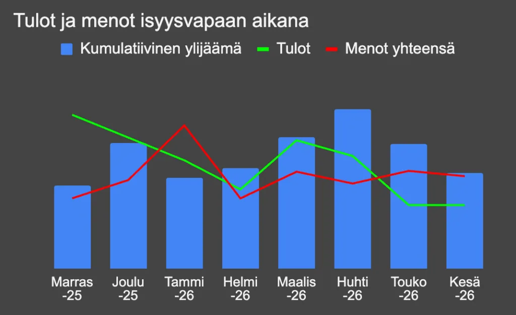 Lopputulos näyttää paremmalta kuin odotinkaan. Riippumatta siitä, missä vaiheessa kevättä tai kesää palaan töihin, emme joudu koskemaan nykyisiin säästöihimme. Voin olla vaikka kahdeksan kuukautta isyysvapaalla, joista suurin osa käytännössä ilman tuloja kotihoidontuella, ja silti meille jäisi rahaa jopa säästöön.