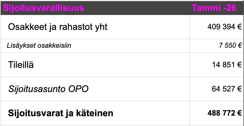Sijoitusvarallisuuteni, ml. osakkeet, rahastot, käteisen ja sijoitusasunto, oli tammikuun lopussa 488 772€. Kuukauden aikana osake- ja rahastosalkkuni rikkoi 400t€:n rajan, mikä on huimaa kun 300 t€ raja meni rikki viime lokakuussa. Varallisuuteni on kasvanut sadalla tuhannella eurolla ihan muutamassa kuukaudessa. Huh!