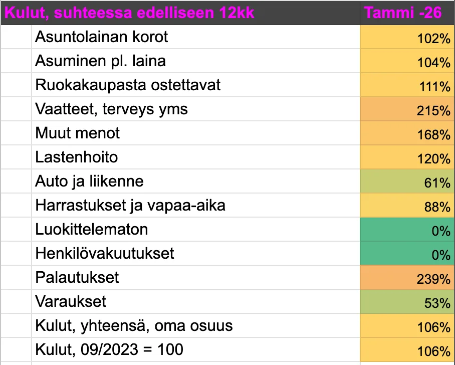 Joulukuussa kulutuksemme oli koholla paitsi vakuutusmaksujen, myös sisustuskulujen takia. Jatkoimme samaa linjaa, miinus ne vakuutusmaksut, tammikuussa: ostimme vähän huonekaluja ja päivitimme myös silmälasit. Näitä ostoksia lukuunottamatta kulutus näytti olevan joka kululajin kohdalla ihan reilassa.